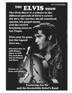 The Elvis Show Posted on May 1, 2012December 29, 2023 A Special ETC Choir Fundraiser: The Elvis Show Featuring Joe Sir and his Rockabilly Rebels Band Saturday May 19 6pm dinner, show at 7pm Das Lach Haus $35 for dinner and show