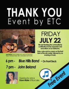 Thanks to our generous donors, contractors and volunteers, we’ve been making the arts center a more convenient and comfortable place for almost a year. It started with the ADA restroom last fall, followed by new deck and entrance this spring, and new restrooms this summer. So -we’re throwing a grand re-opening party!