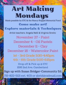 Attention all 1st through 6 graders: Come join us at ETC on Mondays from November 27 to December 18, 2023, and make art! We will be using Paint, Oil Pastels, Clay and Watercolor Paint, with direction by Artist teachers Angela Nelli and Virginia Streitz.