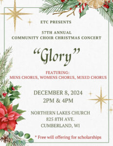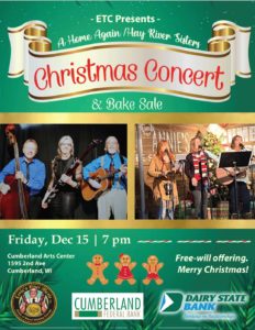 Come enjoy a couple of the bands you saw this summer at Island City Music as they swing into the Christmas Season. Home Again and The Hay River Sisters will each have a set, and then join together with you to sing some of your favorites. And a bake sale to help you with your holiday dining! Just like downtown, a free will offering will be collected. Sponsors for this event are Louie’s Finer Meats, Dairy State Bank, and Cumberland Federal Bank.
